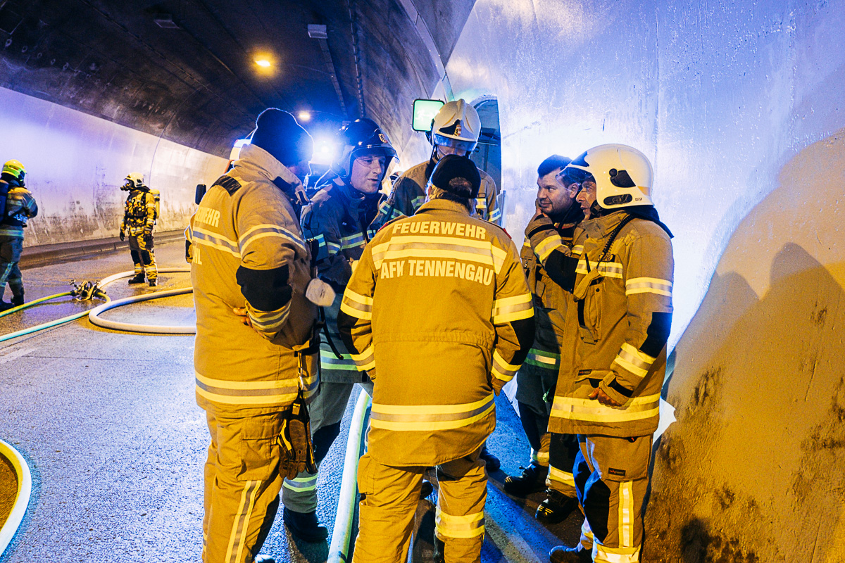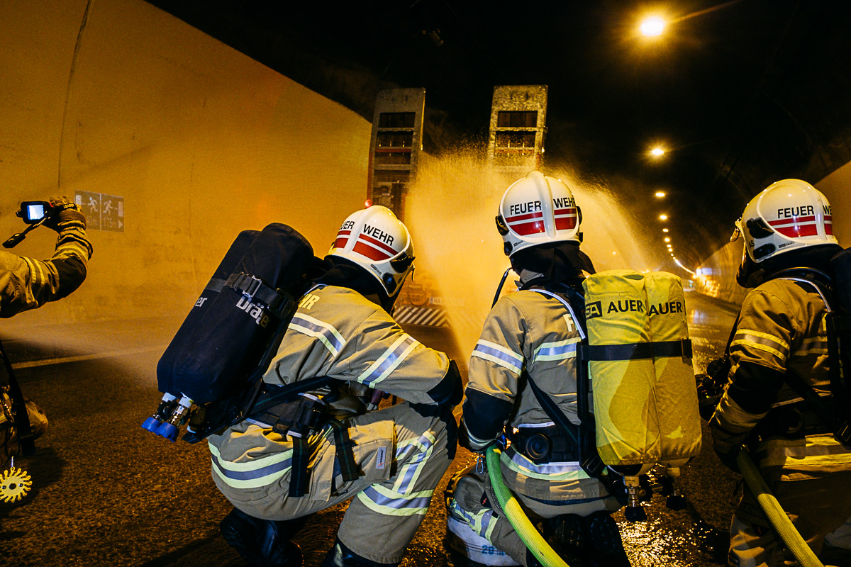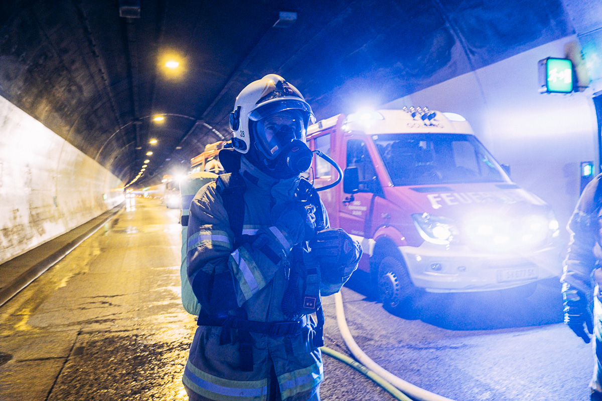 Dieses Übungsszenario war ein Ausschnitt aus einem Brandeinsatz im Tunnel, im Ernstfall und je nach Lage werden mehrere Einsatzkräfte beteiligt sein und auch beide Tunnelröhren für den Verkehr gesperrt sein. Somit sind Fluchtwege frei und für Einsatzkräfte wird es möglich auch durch Querstollen effizient zum Einsatzort zu gelangen.