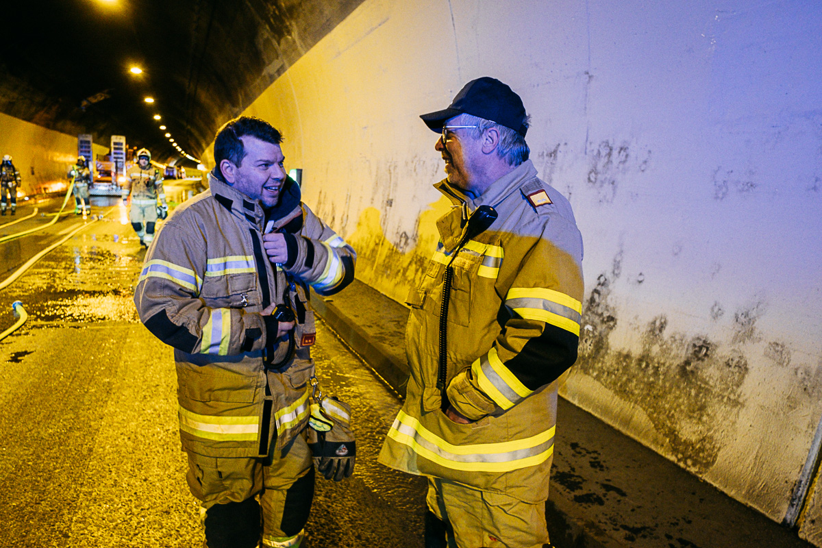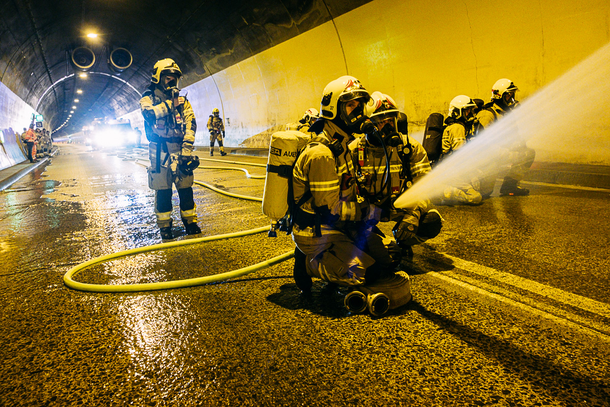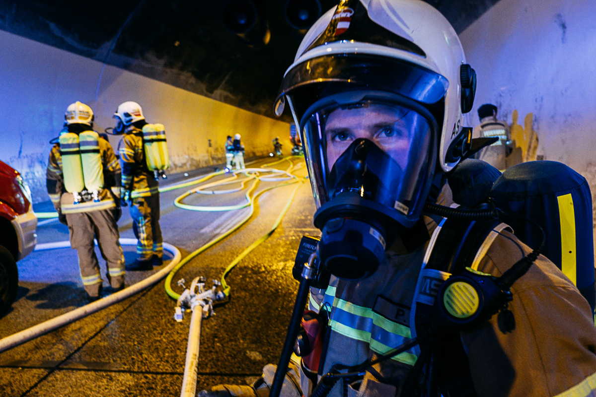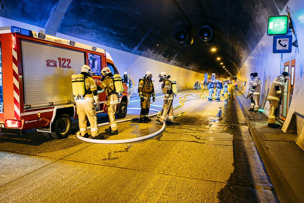 Dieses Übungsszenario war ein Ausschnitt aus einem Brandeinsatz im Tunnel, im Ernstfall und je nach Lage werden mehrere Einsatzkräfte beteiligt sein und auch beide Tunnelröhren für den Verkehr gesperrt sein. Somit sind Fluchtwege frei und für Einsatzkräfte wird es möglich auch durch Querstollen effizient zum Einsatzort zu gelangen.