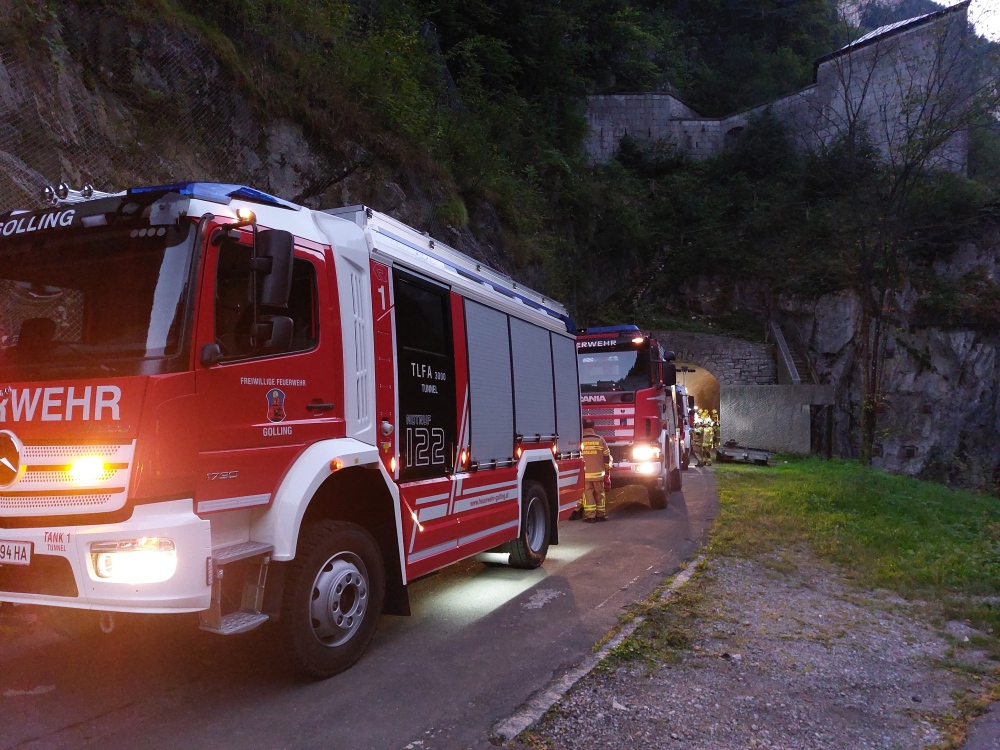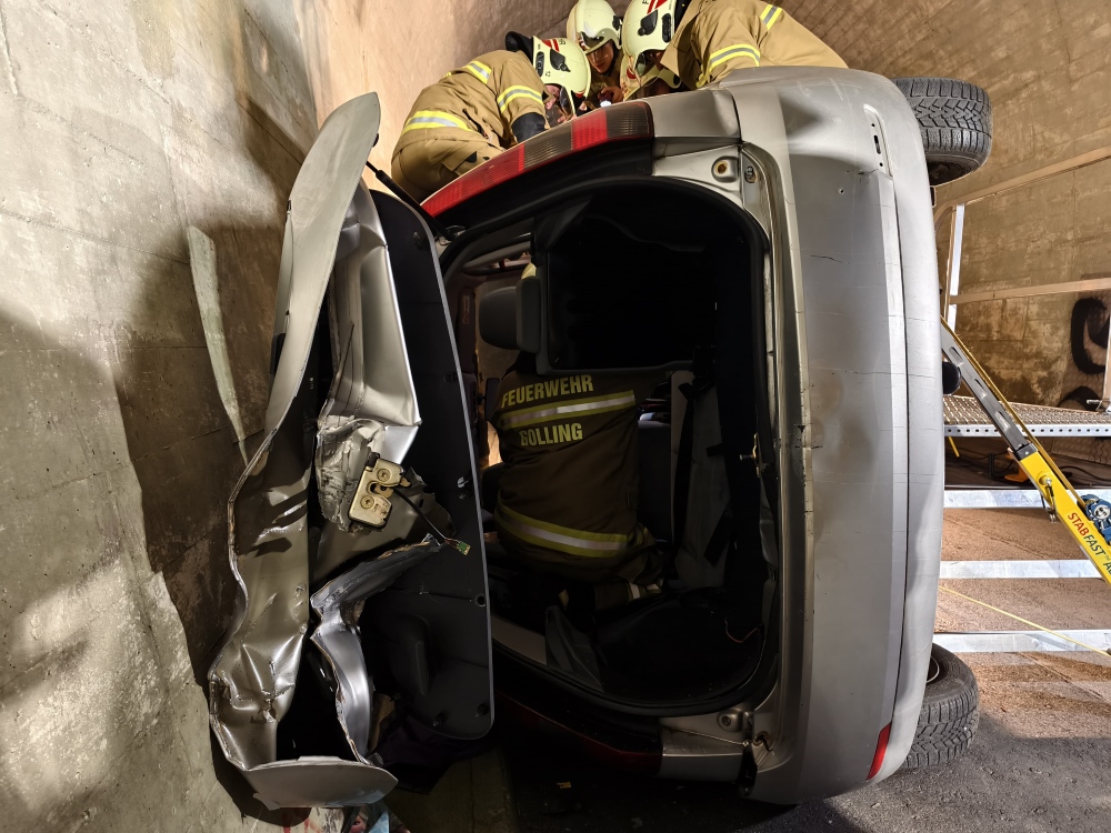 Die Feuerwehr Golling absolvierte letzten Donnerstag eine anspruchsvolle technische Übung in einer Tunnelanlage. Szenario war ein Verkehrsunfall mit einem seitlich auf der Fahrertür liegenden Pkw, der zusätzlich an die Tunnelwand angelehnt war. Im Inneren befanden sich zwei verletzte Personen, deren Rettung unter den beengten Bedingungen durchgeführt werden musste.