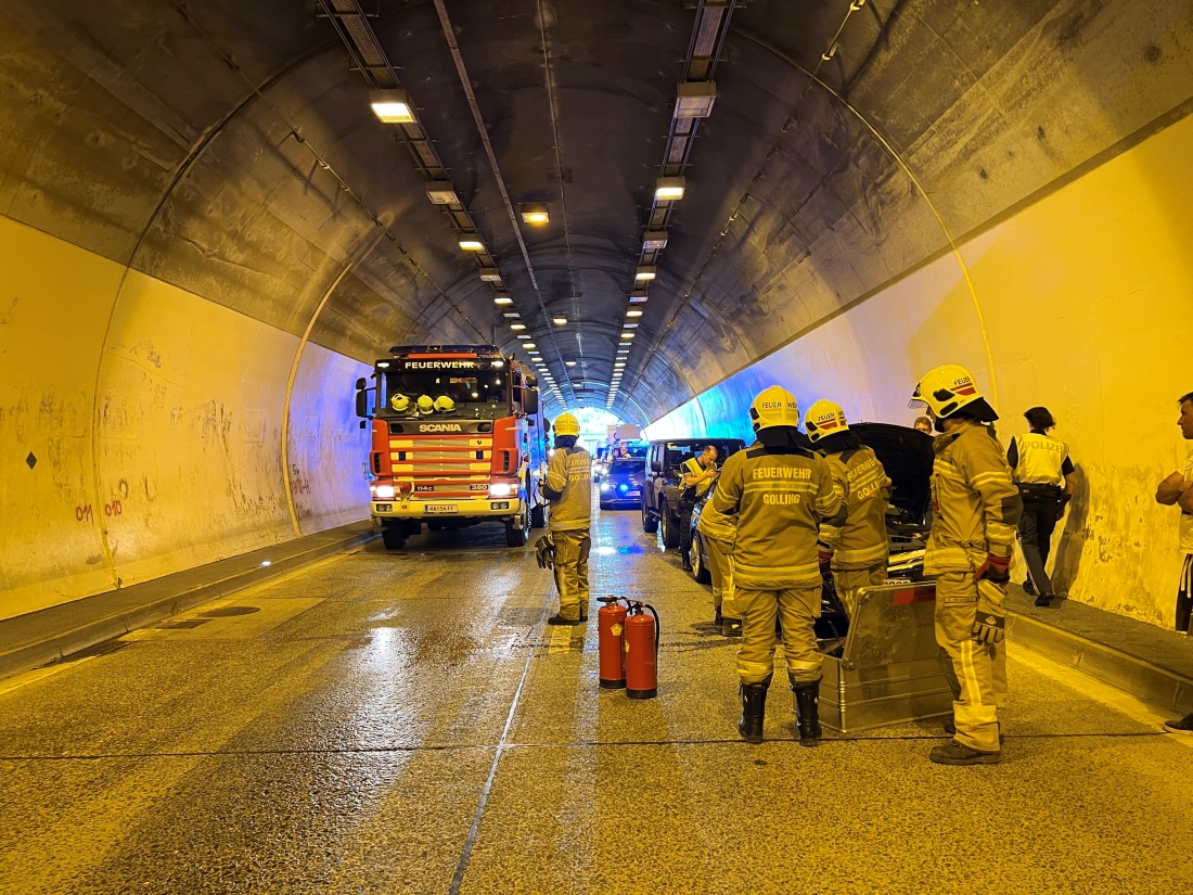 An diesem Freitagnachmittag wurde die Feuerwehr Golling um 15:09 Uhr zu einem Verkehrsunfall im Ofenauertunnel alarmiert. Drei Fahrzeuge kollidierten miteinander im Bereich des Tunnelportals. Bis zur Ankunft an der Unfallstelle war unklar, ob noch Menschen in ihren Fahrzeugen eingeklemmt sind. Vor Ort stellte sich glücklicherweise heraus, dass es sich nur um einen Auffahrunfall mit mehreren Fahrzeugen und ohne Personenschaden handelte.