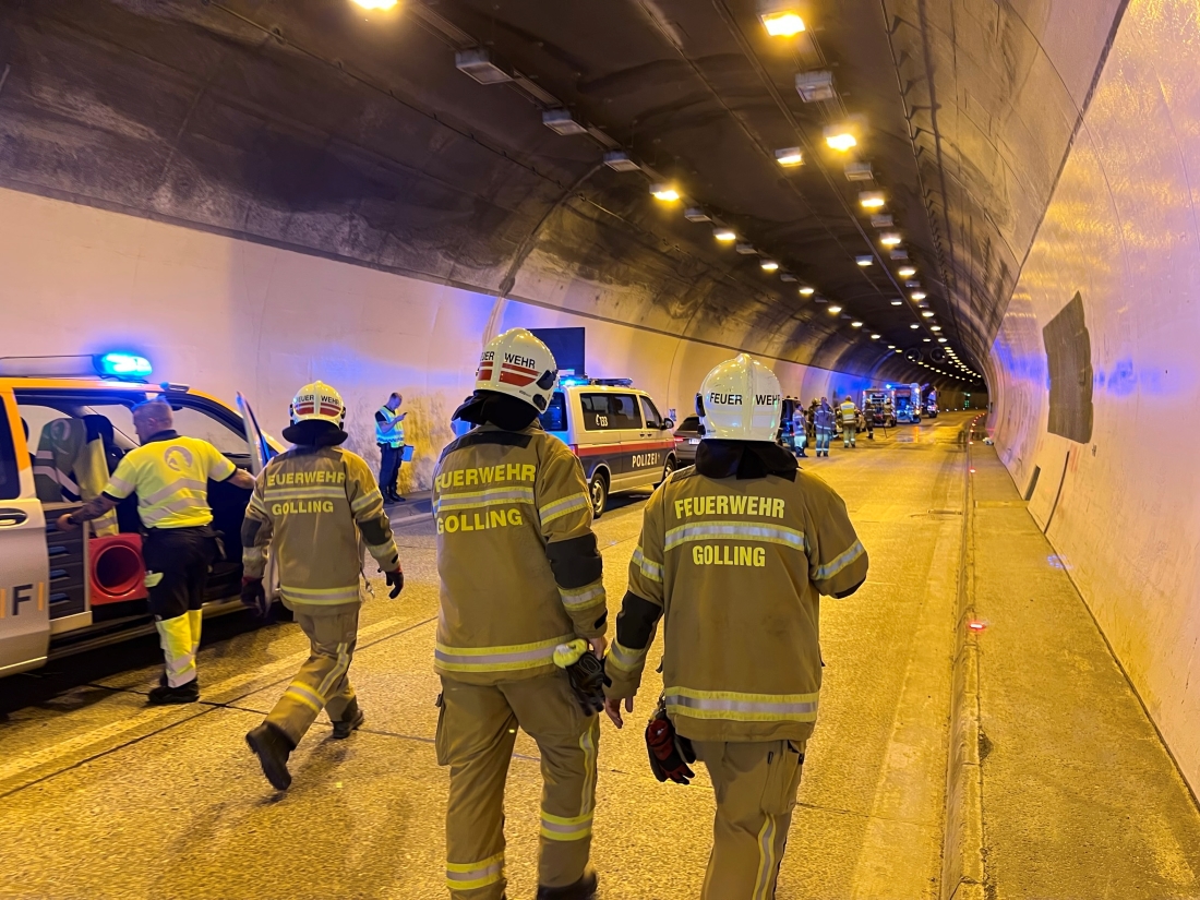 Innerhalb kürzester Zeit nach der Alarmierung rückten 5 Fahrzeuge und 34 Mann aus Golling zum Unfall auf die A10 Tauernautobahn ab. Aufgrund des dichten Reiseverkehrs und dem Rückstau vor dem Tunnel mussten die Einsatzkräfte in der Rettungsgasse, welche leider nur bedingt funktionierte, in den Ofenauertunnel einfahren.