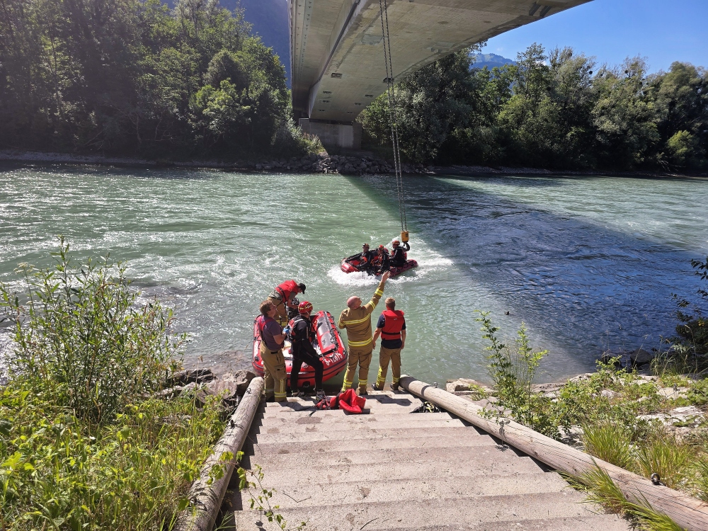 Binnen weniger Minuten rückten die Einsatzkräfte aus und setzten das Feuerwehrboot bei der Anlegestelle zu Wasser. Zeitgleich konnte die Besatzung des Rettungshubschraubers die verunglückte Person am Ufer lokalisieren, landen und unverzüglich mit lebensrettenden Maßnahmen beginnen. Der Verunfallte wurde gemeinsam mit dem Notarztteam unter laufender Reanimation mit dem Boot der Feuerwehr Golling zur Anlegestelle gebracht, wo auch der Hubschrauber zwischenzeitlich gelandet war.