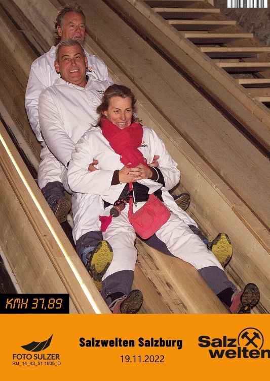 Abfahrt war an diesem Samstag um 13:00 Uhr beim Feuerwehrhaus in Golling. Ca. 45 Teilnehmer (Aktive sowie nichtaktive Mitglieder und deren Partnerinnen) hatten sich vorab für den diesjährigen Feuerwehrausflug angemeldet. Mit einem Bus der Fa. Fischwenger begaben wir uns auf den nahegelengen Dürrnberg, wo wir vor Ort mit weißen Anzügen der Bergleute ausgestattet wurden. Nach einer Begrüßung mit Salzbrot und einem kleinen Schluck Schnaps, ging es mit dem „Grubenhund“ (der Eisenbahn) in den Stollen. Bei der ca. 1,5h Tour begaben wir uns auf die Spur des weißen Goldes, quer durch vier Epochen des Salzabbaus in Salzburg. Beginnend beim modernen Bergbau und bei der Salzproduktion der Gegenwart, führte uns der Guide weiter durch das Mittelalter und schließlich zurück bis in die Eisenzeit zu den keltischen Bergleuten.