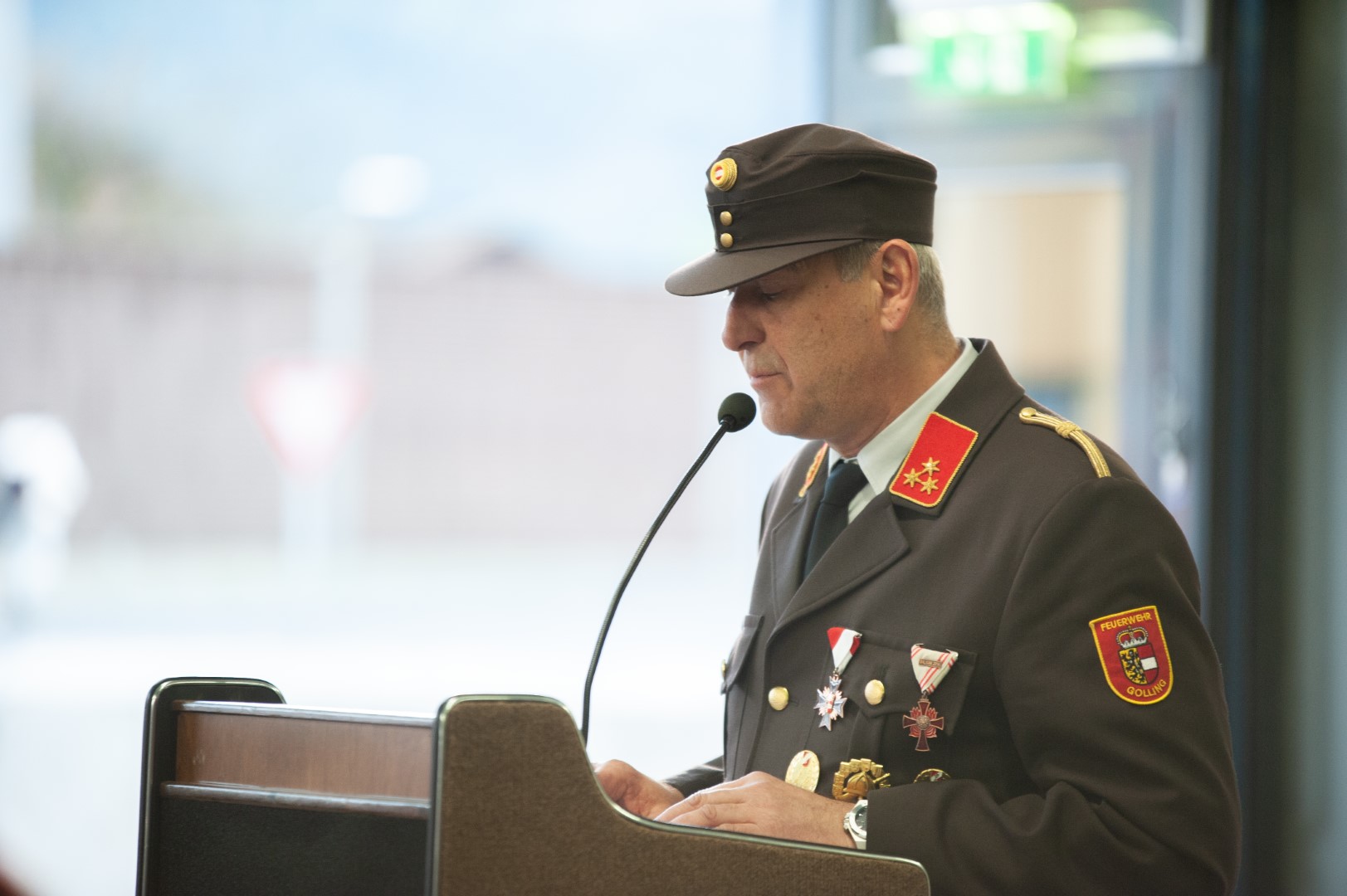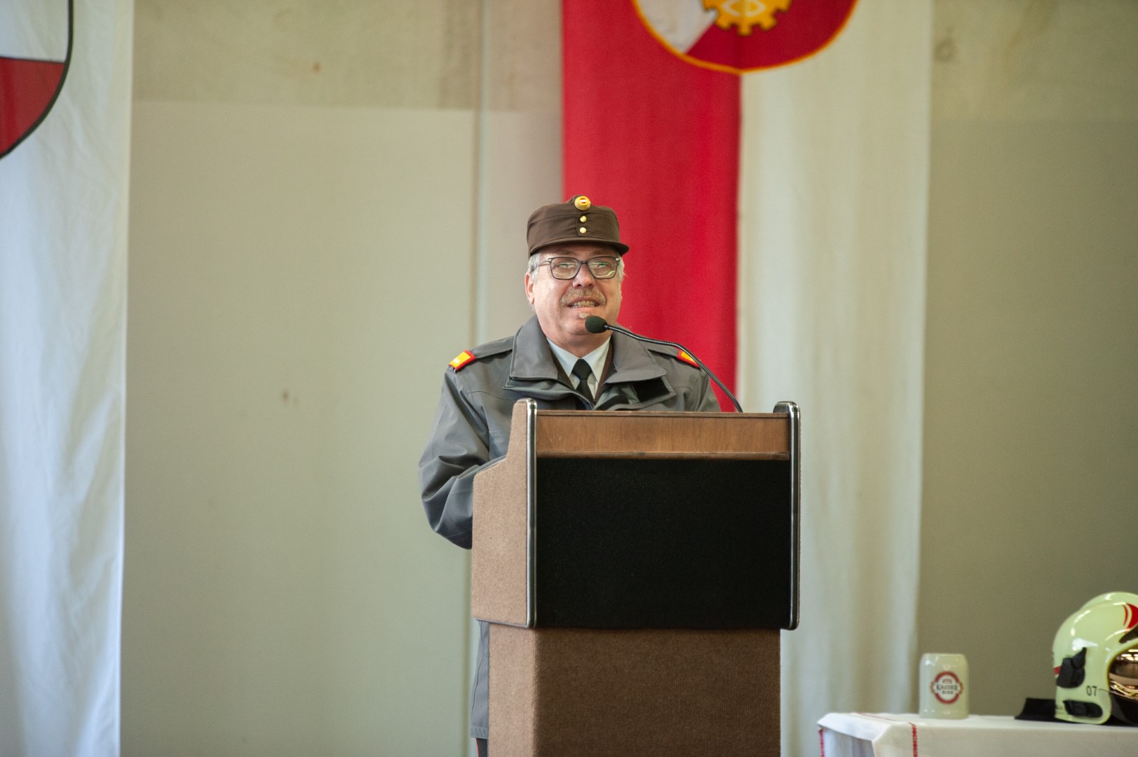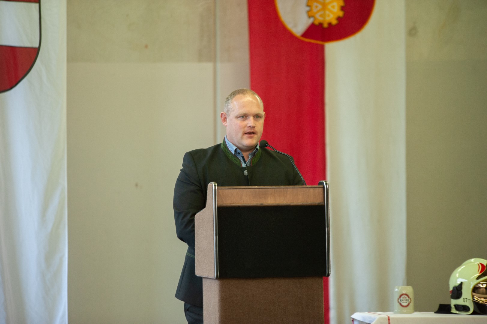 Da das Wetter in diesem Jahr leider nicht mitspielte, wurde der Festakt kurzerhand in die Fahrzeughalle der Zeugstätte verlegt. Ortsfeuerwehrkommandant HBI Gerald Dygruber gab in seiner Ansprache einen Rückblick auf ein gelungenes und unfallfreies Jahr.