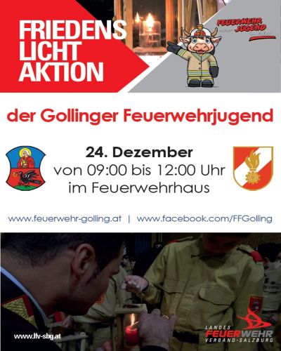 Die Feuerwehrjugend Golling verteilte auch heuer am 24. Dezember das Friedenslicht aus Bethlehem beim Feuerwehrhaus. Viele Besucherinnen und Besucher nutzten die Gelegenheit, das Licht abzuholen und mit einer freiwilligen Spende einen guten Zweck zu unterstützen.