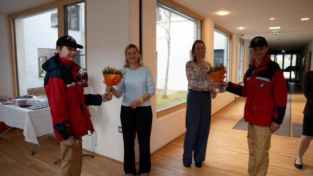 Bezirkssachbearbeiterin OVI Marlene Bischof und zwei Mitglieder der Feuerwehrjugend überreichten Frau Grill sowie Frau Saringer als Dankeschön für die hervorragende Zusammenarbeit einen farbenfrohen Blumenstrauß.