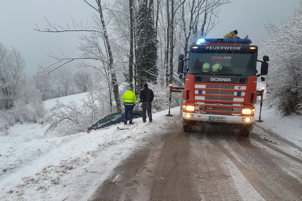 Die Feuerwehr Golling wurde am Dienstag um 13:02 Uhr zu einer Fahrzeugbergung in der Trögergasse alarmiert. Laut Erstmeldung war ein Fahrzeug infolge des starken Schneefalls im Bereich der Zufahrt zum Friedhof abgestürzt.